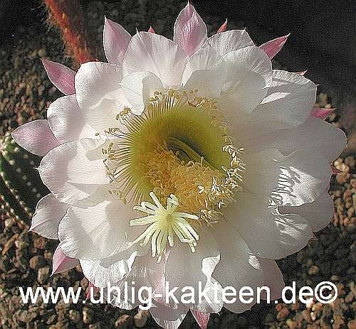 | Merkmale: | Blüte groß weiß, außen rosa, kurz bedornt |