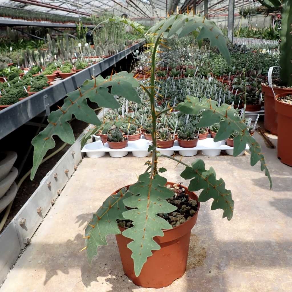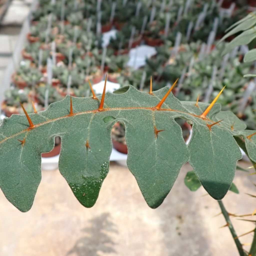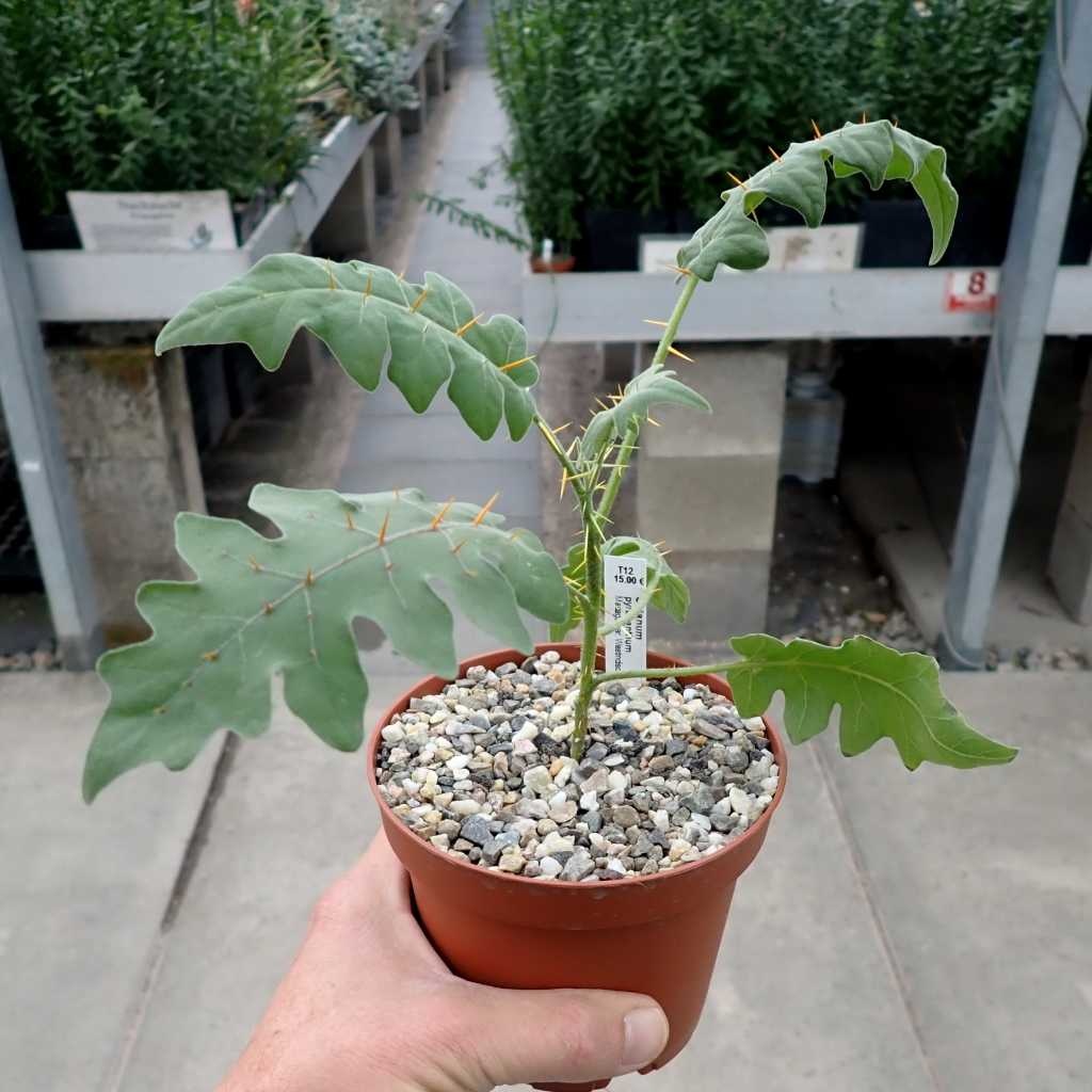 | Merkmale: | mehrjähriger, immergrüner, kleiner, krautiger Strauch bis ca. 2 m mit orangefarbenem Stamm und Zweigen, wechselständig angeordneten, bis zu 20 cm langen, tief gelappten, oberseits wie auch unterseits mit langen, orangefarbenen Dornen besetzten, samtigen, bläulich-grünen Blättern mit orangefarbener M |