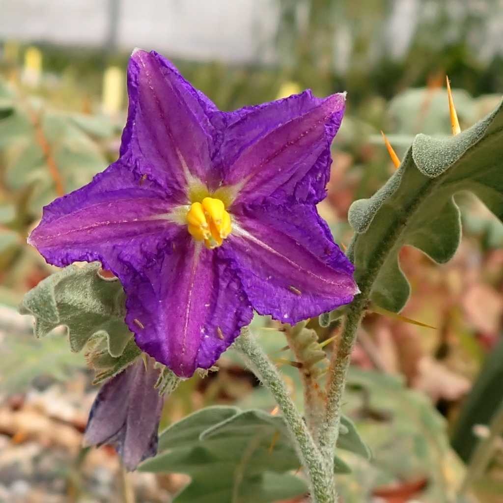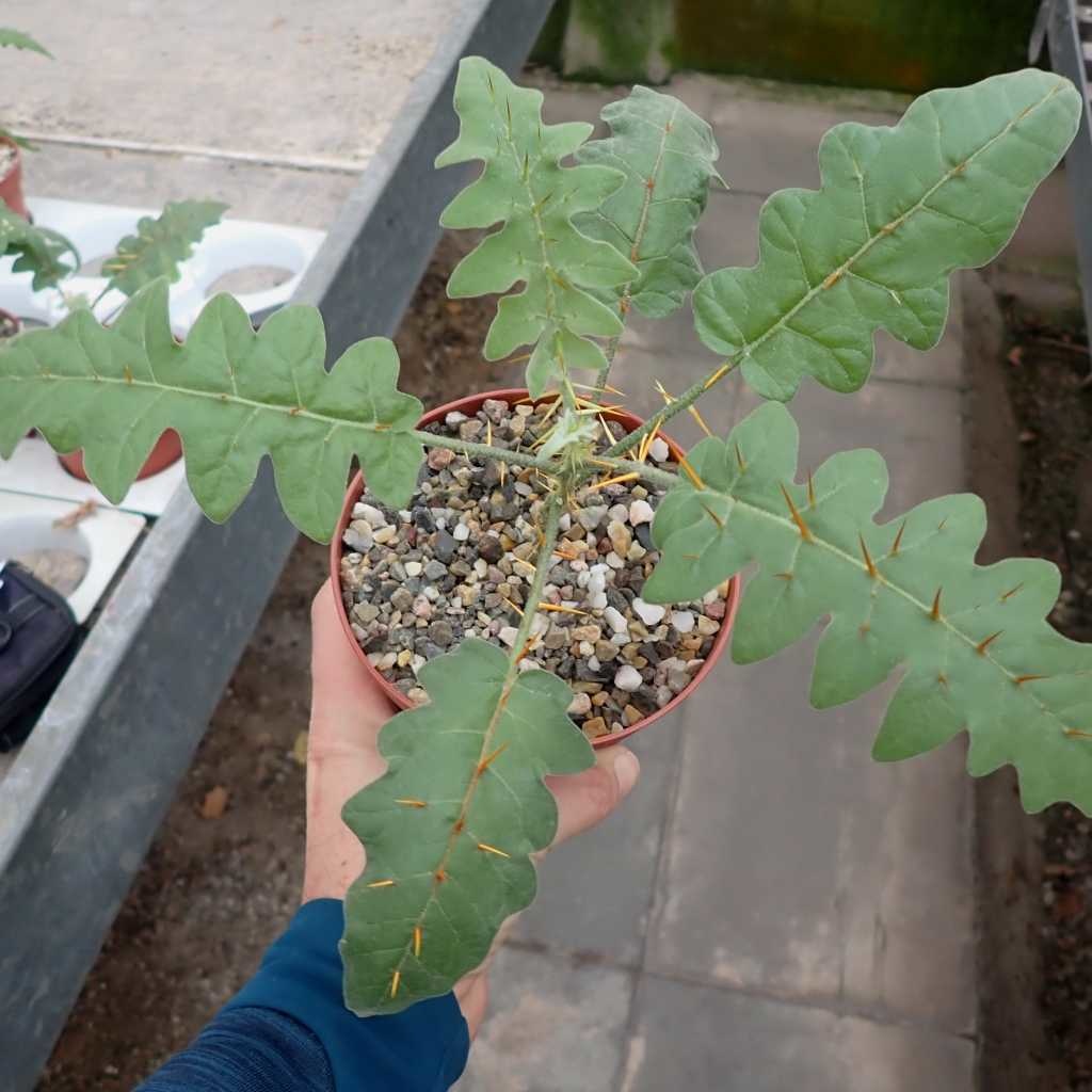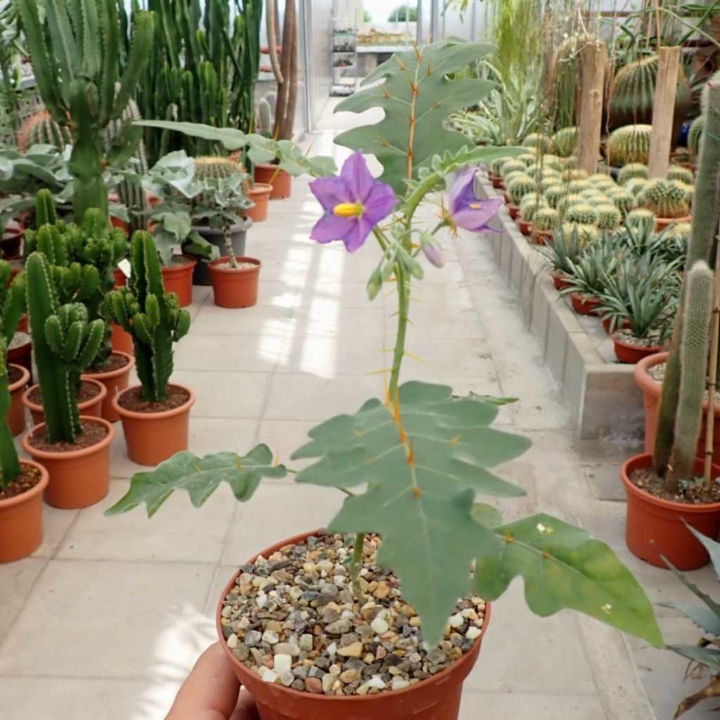 | Merkmale: | mehrjähriger, immergrüner, kleiner, krautiger Strauch bis ca. 2 m mit orangefarbenem Stamm und Zweigen, wechselständig angeordneten, bis zu 20 cm langen, tief gelappten, oberseits wie auch unterseits mit langen, orangefarbenen Dornen besetzten, samtigen, bläulich-grünen Blättern mit orangefarbener M |
