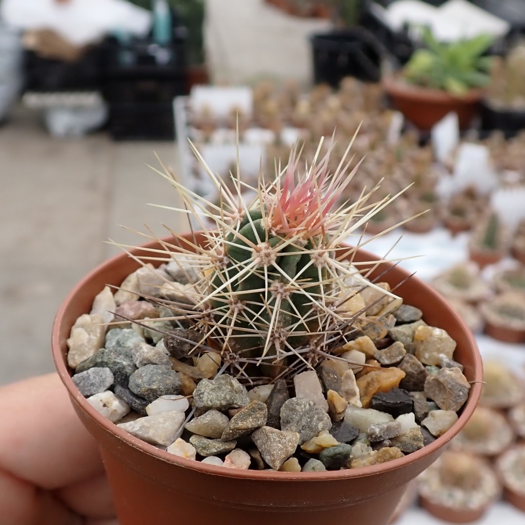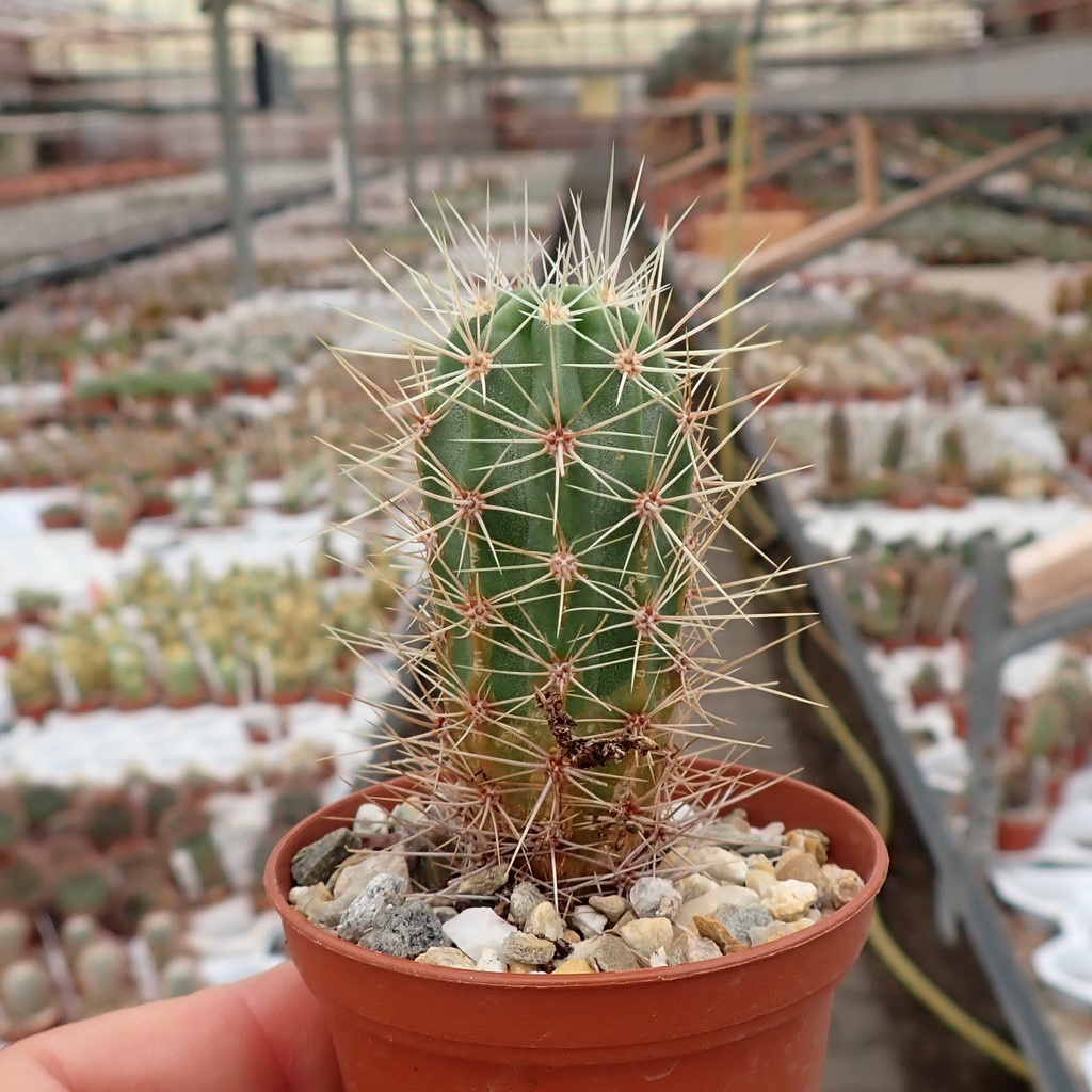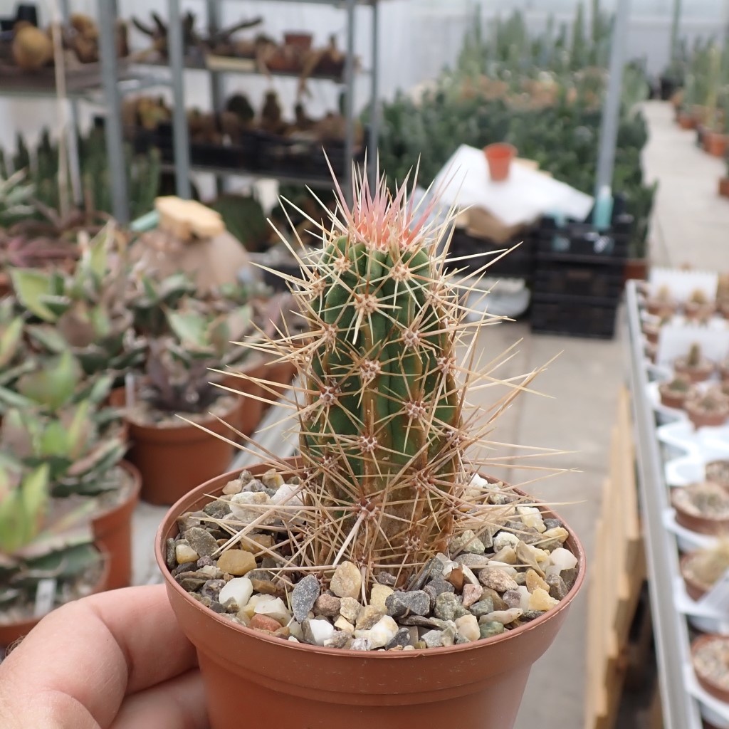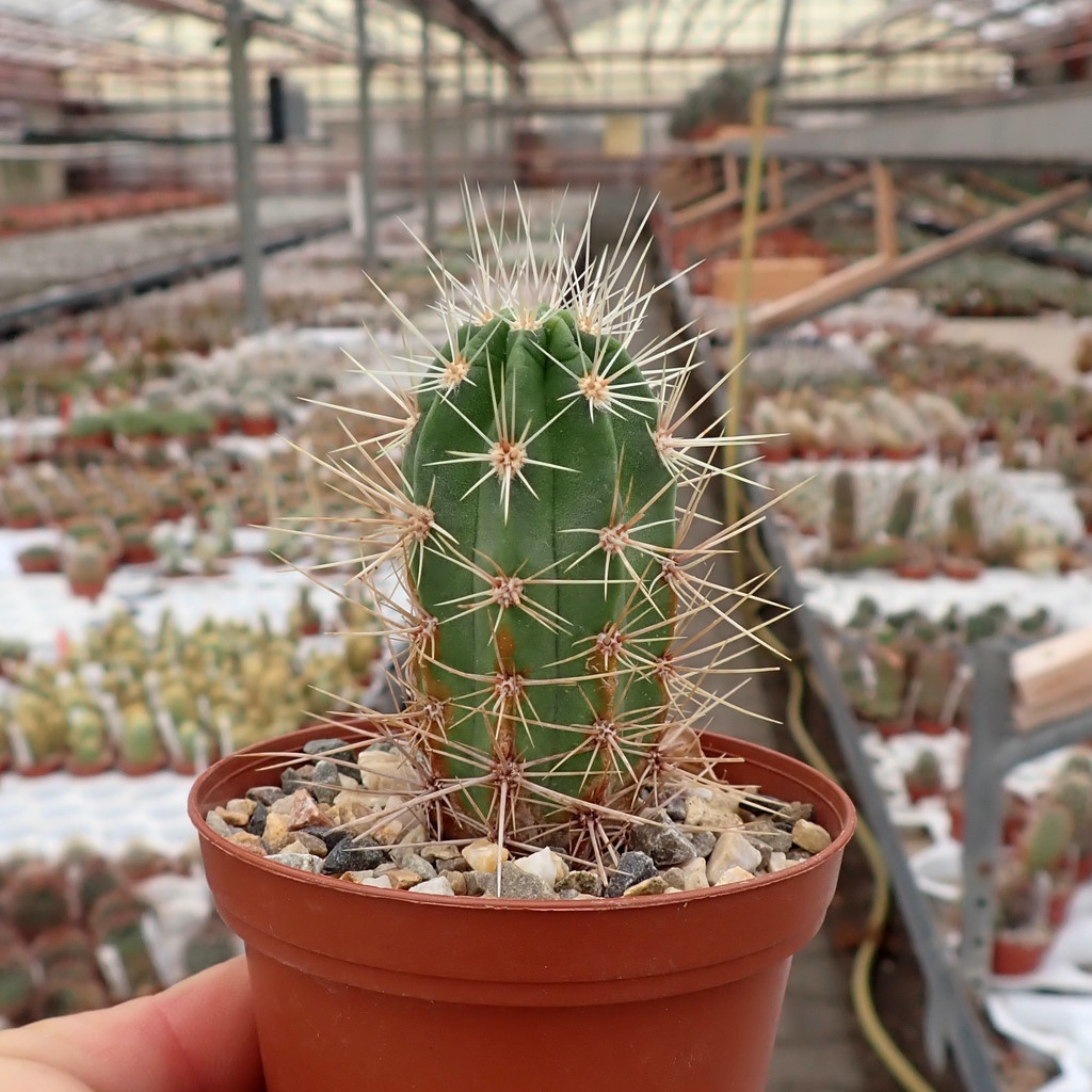 | Characteristics: | Kompakter Kaktus mit zylindrischen, grünen Trieben, bedeckt von dichten, gelblichen Dornen und leuchtend gelben Blüten. |