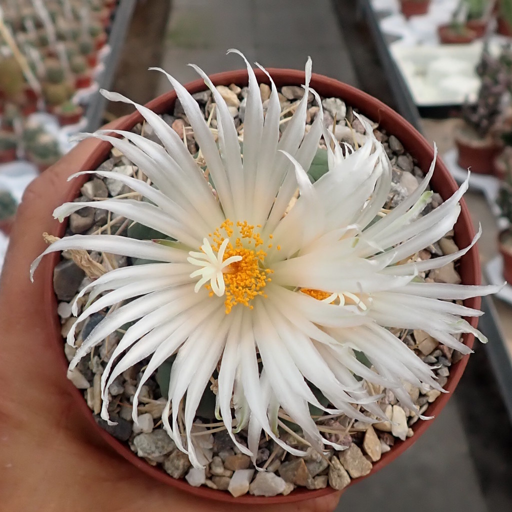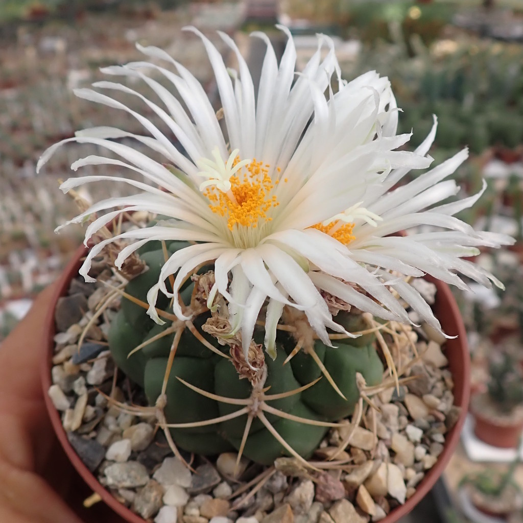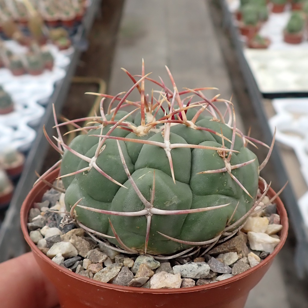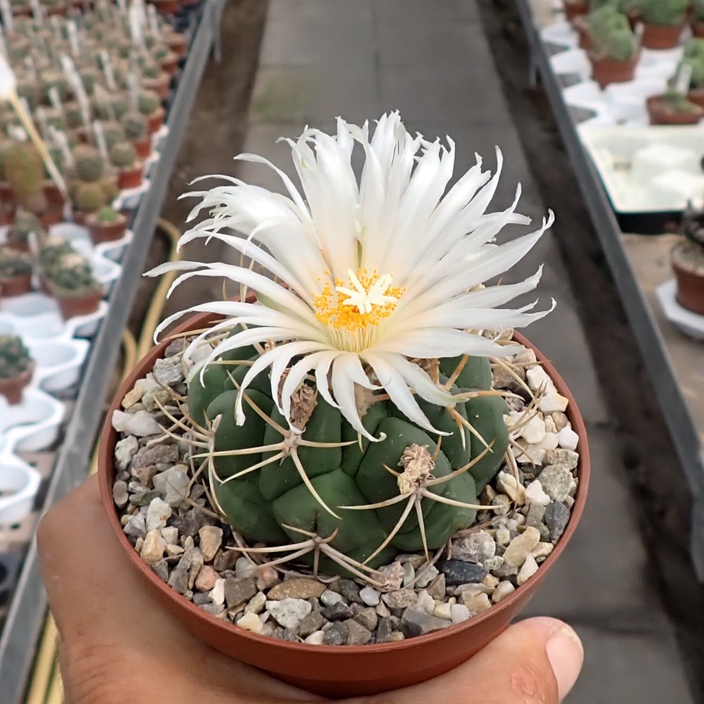 | Characteristics: | graugrün, breite Warzen, kurz-hellrot bedornt, Blüte weiß |